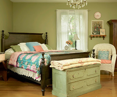When trying to create a vintage vibe, color selection is essential. Here, a green, pink, blue, and white color scheme works together to make the bedroom look like it's straight out of the 1920s. Don't be afraid to mix different shades of colors and to play with patterns. Dark wood furnishings add sophistication to the decor .