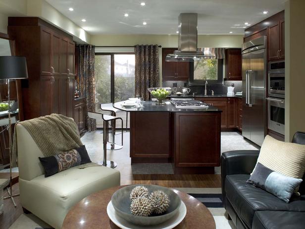 Integrate family rooms into the kitchen through color. Dark, espresso-toned cabinets coordinate well with this space's black sofa and warm khaki walls.